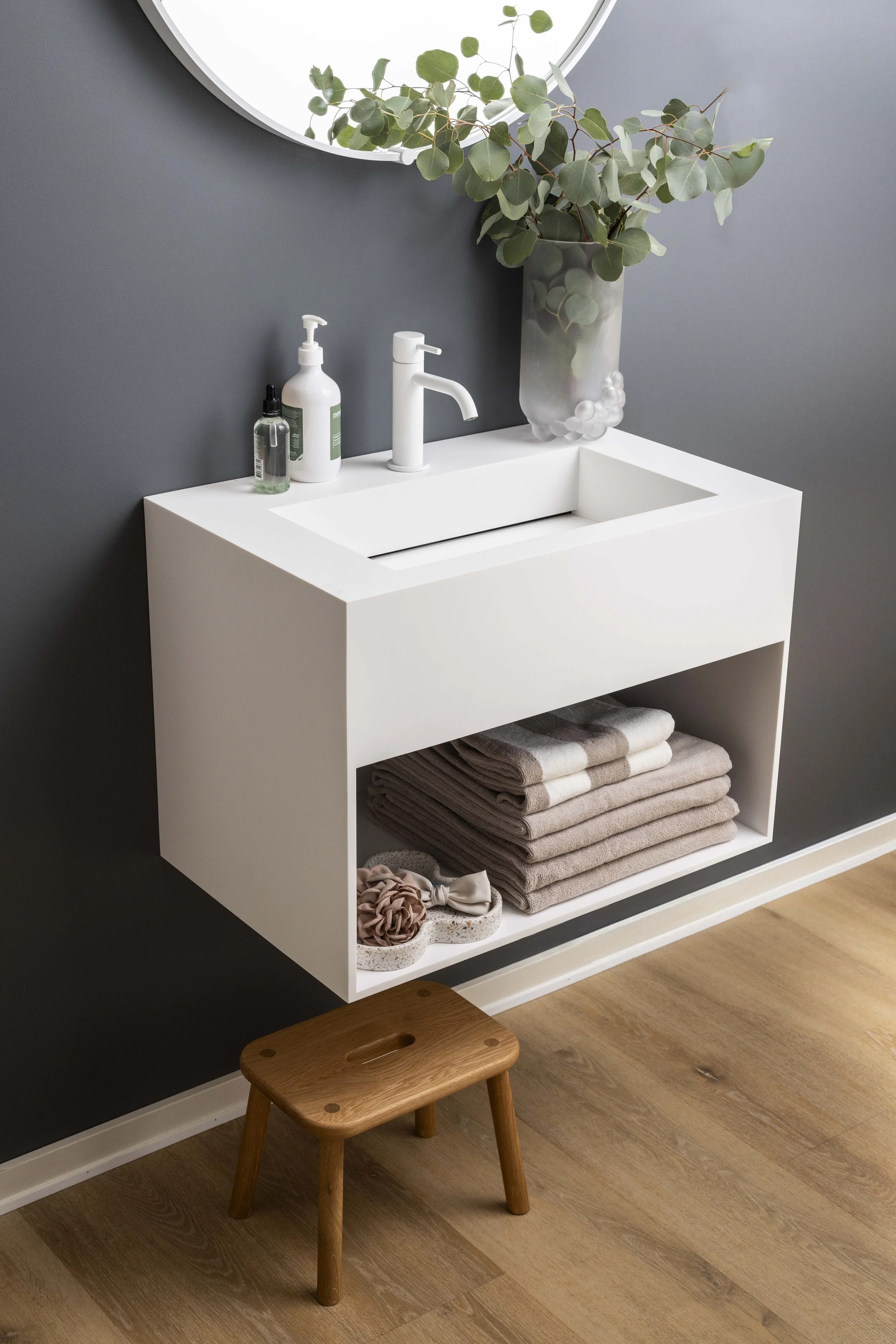 Vaske til badeværelset. Badvaske. Bordplade badeværelse. Bad. Helstøbte vaske og bordplader til dit badeværelse. Bordplade med integreret vask. Badvaske i Marmor, Keramik, Silestone, Trento (Solid Surface) og Glas (glasmat).