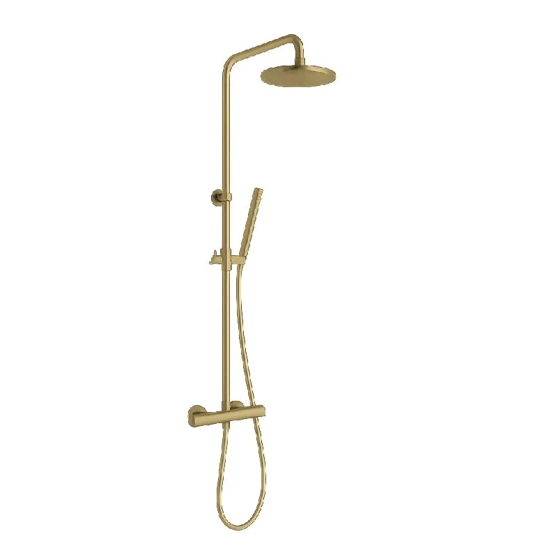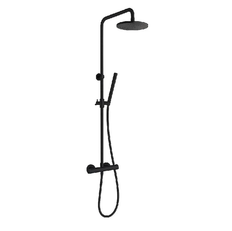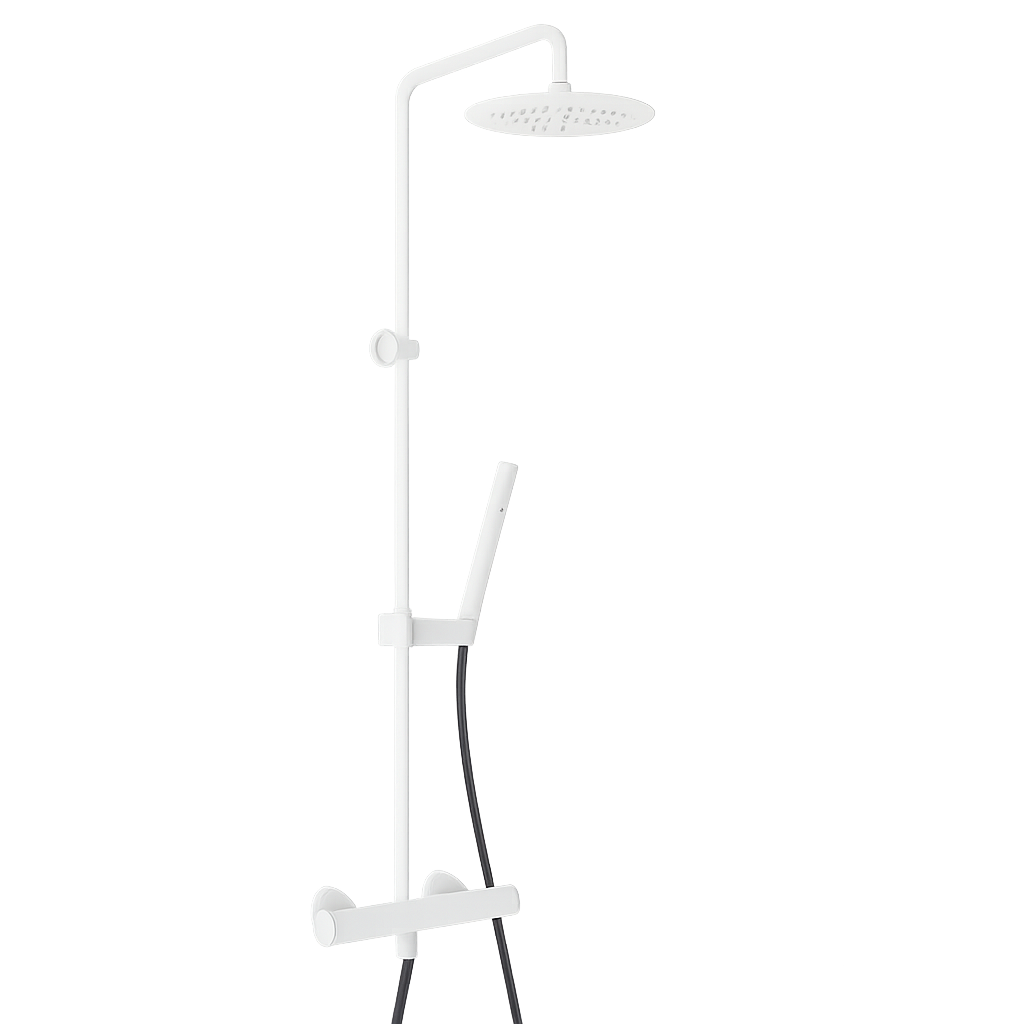Termostatisk udvendig brusemixer med justerbar søjle, omskifter, fleksibel Silitech-slange, håndbruser og brusehoved.