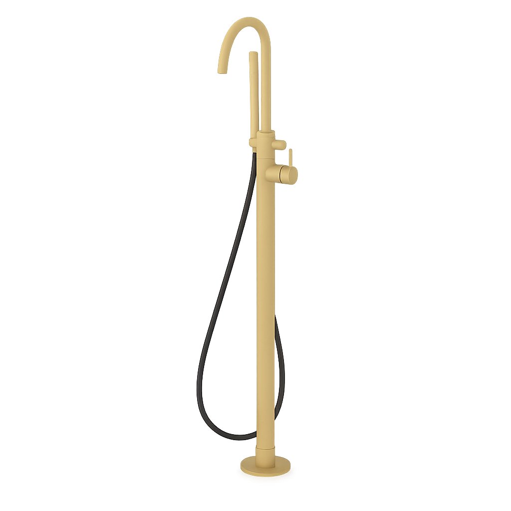 Fritstående badekarsøjle med Silitech-slange og håndbruser i messing samt Techno-Box.