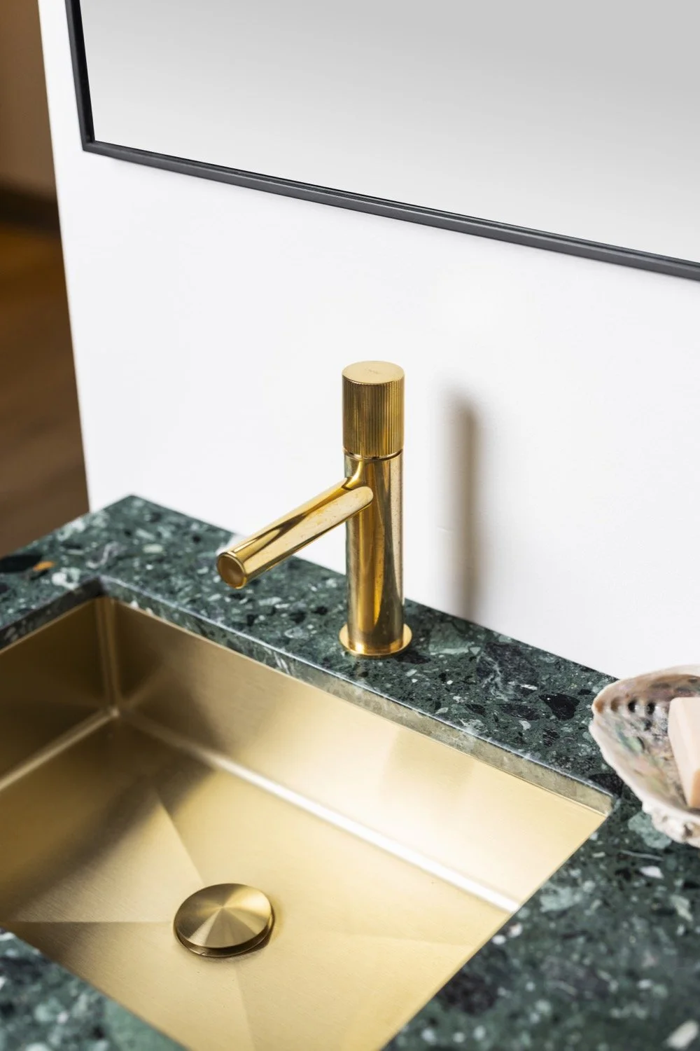 Kataloget fra Marbre DESIGN rummer en lang række effekter på badeværelset, der giver lyst til at blive lidt længere bag den låste dør. For eksempel et spejl med en hylde med indbygget trådløs mobilopladning. En krystalblank, bronzefarvet glasvask eller en elegant, dråbeformet vandlås med en skulpturel effekt der nærmest beder om at blive vist frem.
