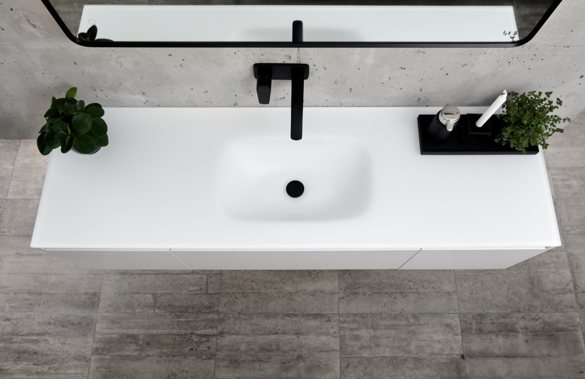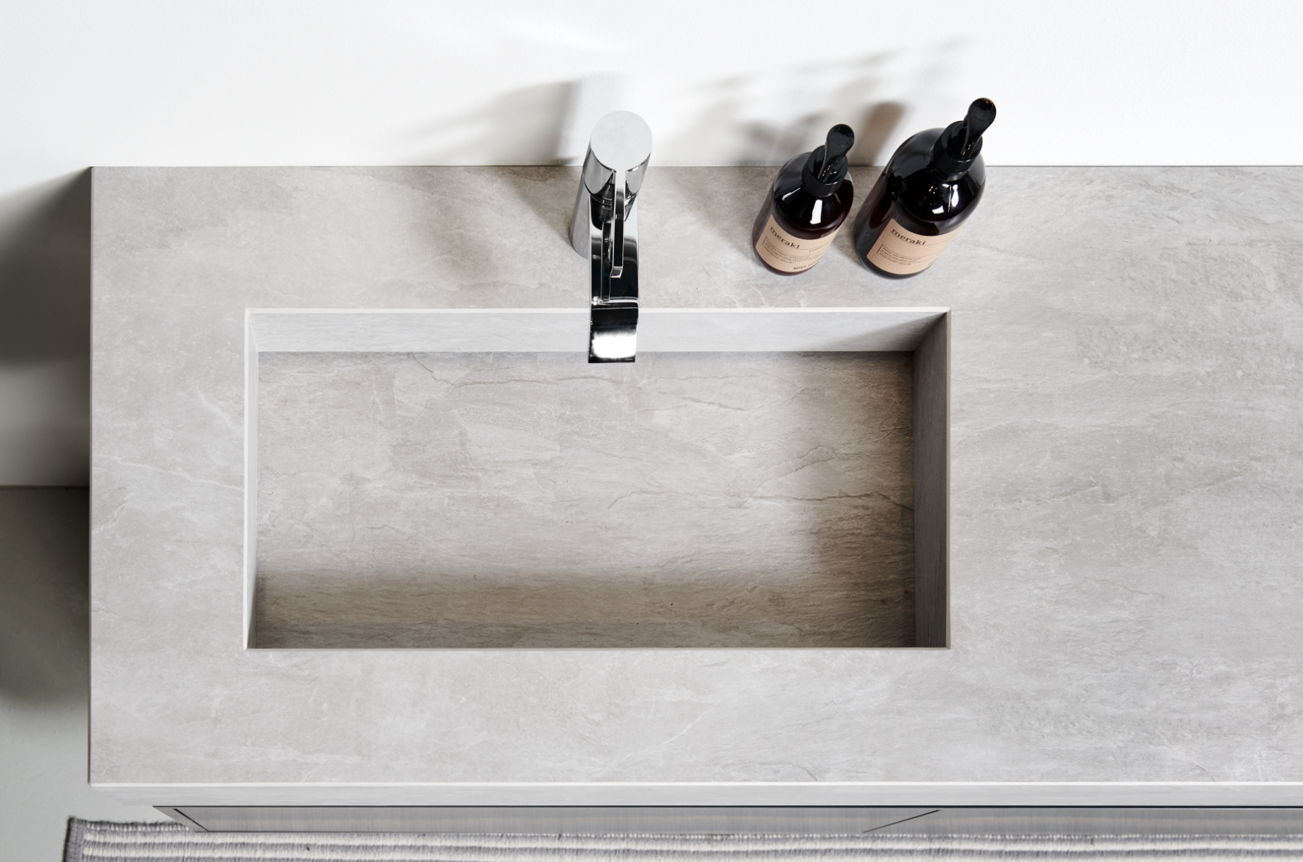 Innovation ses også i designet af vaskene. Særligt keramikvaskene med den flotte struktur fra naturgranit leger med øjnene. For hvor er afløbet? Vasken er som et kar, der er hugget ud bordpladen uden det velkendte hul i bunden til afløbet. Afløbet er i dette tilfælde skjult i vaskens bagkant, hvilket giver et elegant udtryk, der giver en fornemmelse af luksuriøs spaoplevelse.